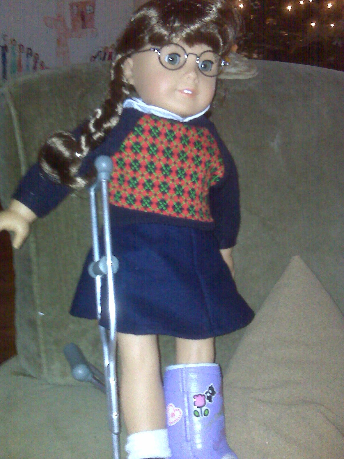 Molly, one of Fontaine’s Christmas gifts, was previously sentenced to an American Girl-brand wheelchair, due to Fontaine’s fascination with people in wheelchairs. A previous post about poor Molly’s plight was one of the most popular ever here at MTD.com (aside from one entitled “Mommy Missing; Missing Mommy,” though Wife speculated that people probably clicked on that one to see if she had permanently fled the premises).